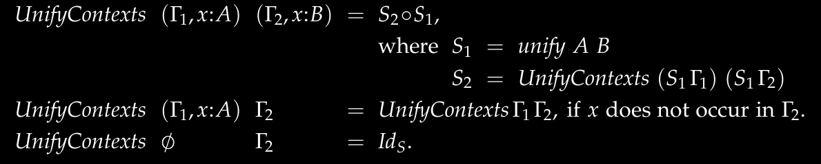 Context unification uses the previously defined unify function. It means that if a variable x is defined in both contexts, then all such x's need to be unified, and the final map is all these maps composed.